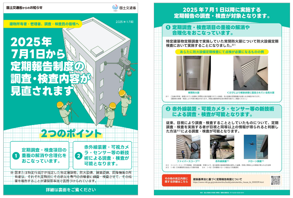 この改正では特定建築物における定期調査・検査項目との重複の解消や検査の合理化、並びに赤外線装置・可視カメラ・センサー等の新技術による調査・検査を想定した改訂が行われました。